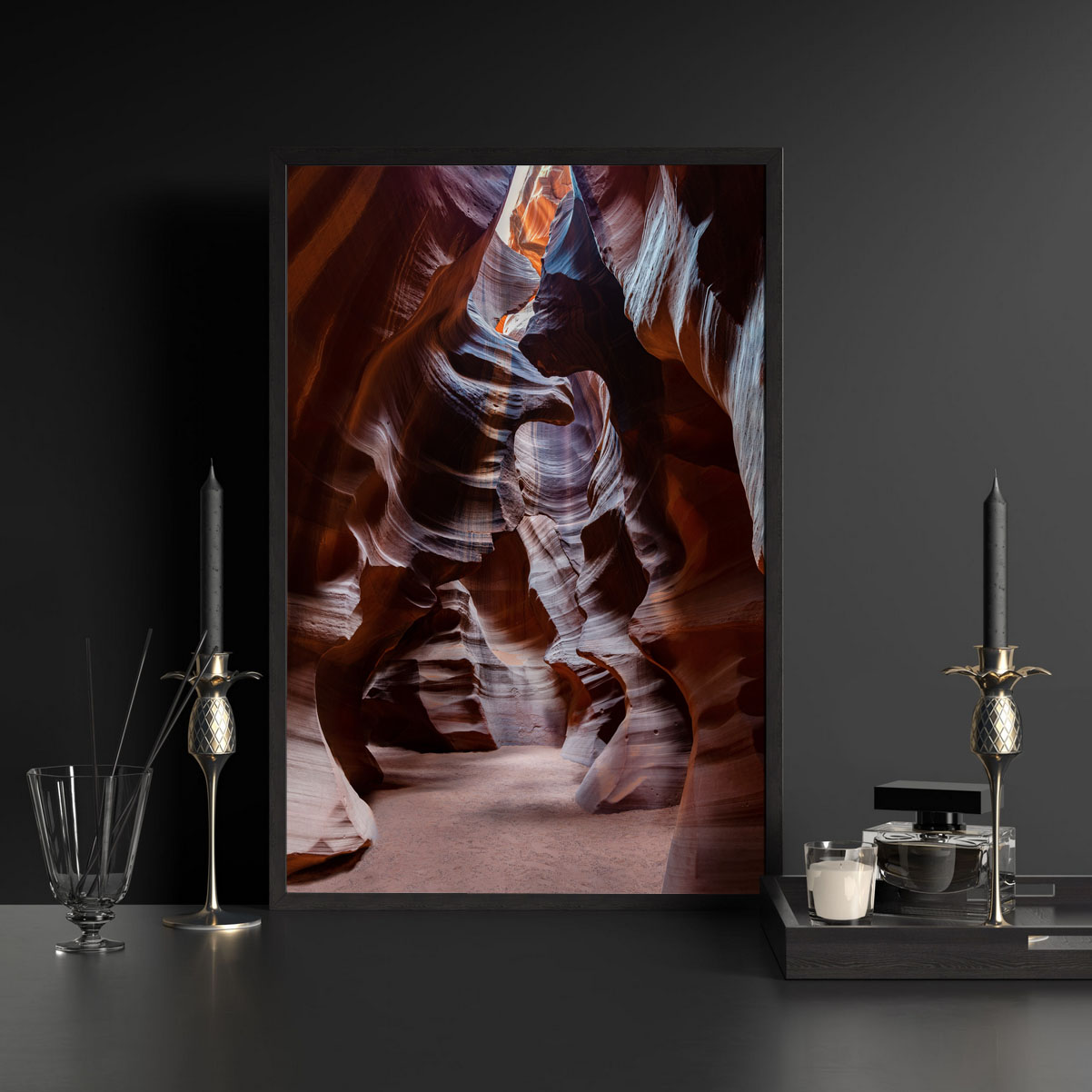 Ao final de cada página escolho uma imagem que me agrada e faço uma simulação dela como um quadro. Os tons quentes do Antelope Canyon, na minha opinião, sempre ficam mais destacados com tons escuros a sua volta. Aqui optei por um quadro pequeno sobre a bancada e escorado na parede, mas este lugar é tão lindo que merece uma tela maior.